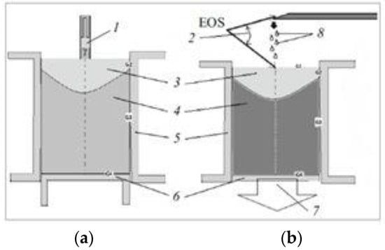 Schematic diagram of the EBMR process: (a) a scheme of the method of disk melting and (b) a scheme of the method of drip melting with a horizontal feeding of the source material: (1) electron beam; (2) scanning electron beam (formed in one or several electron optical systems EOS); (3) pool of liquid metal; (4) solidifying ingot; (5) water-cooled side walls of the copper crucible; (6) water-cooled mobile bottom (puller); (7) direction of elongation of ingot; and (8) drops of molten metal [,].