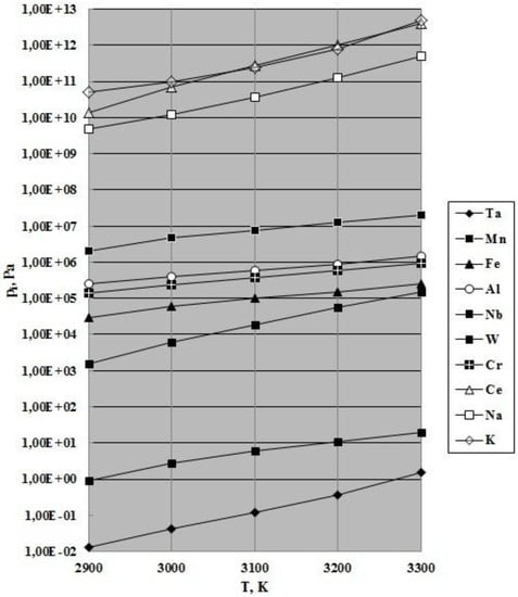 Partial pressure of studied metals in the temperature range 2900–3300 K.
