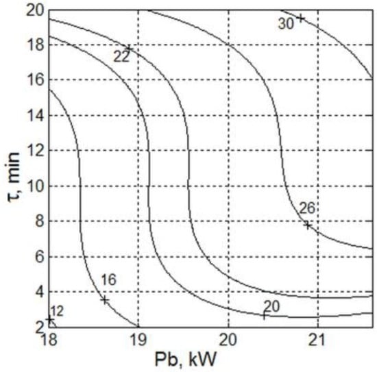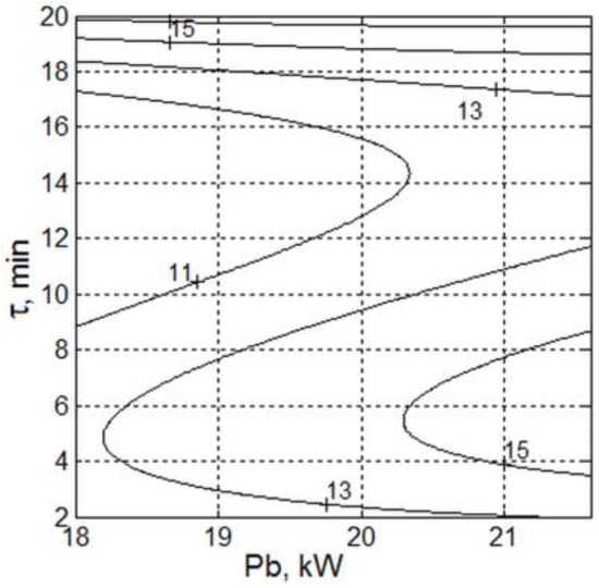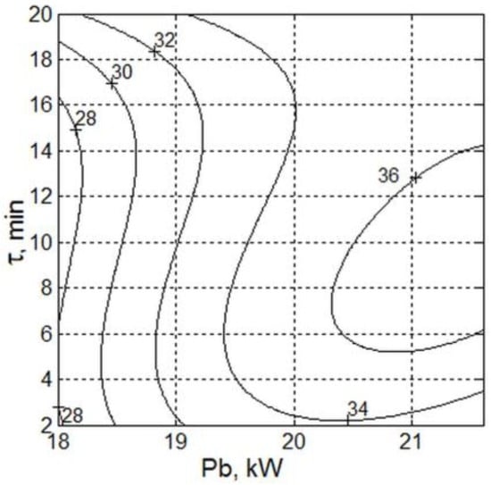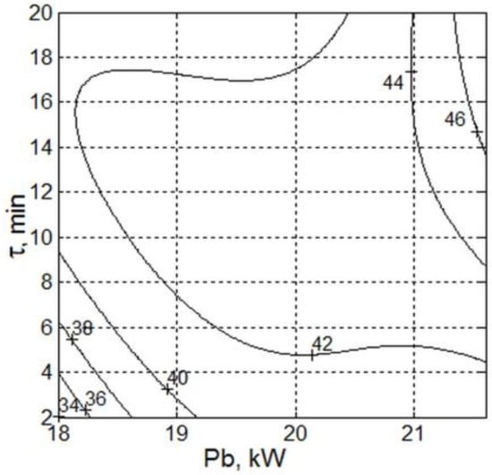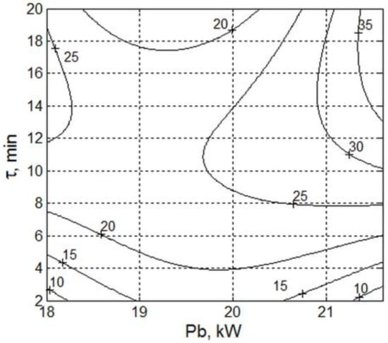 The values of the determination coefficients R2 and adjusted R2(adj)—the square of the multiple correlation coefficients, which are measures for the model accuracy (the closer these values are to 100% , the better the model is)—are: R2 = 97.7% and R2(adj) = 95.8%. The estimated model is good for prognostication and can be used for process parameter optimization. Figure 3 shows the contour plot of material losses, depending on both the process parameters: the beam power Pb and the refining time τ. Areas with minimal material losses are seen at: τ < 4 min and Pb < 19 kW or Pb > 21 kW for the investigated regions of the process parameters (Table 1).