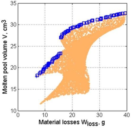 If the optimization requirements deal with only two of the characteristics, e.g., minimal material losses (Wloss) and maximal pool volume (V), a group of Pareto-optimal solutions, forming the so called Pareto-front, are obtained and are shown in Figure 8. Some of the obtained Pareto-optimal solutions and the corresponding EBM process conditions are presented in Table 9. The obtained results show that, for the investigated regimes, the estimated models and relations can be utilized for improvement of EBMR in different ways by specifying characteristic requirements that support the process of refining of tantalum. One can see that the minimal material losses are observed for the following regime conditions: Pb = 18.10 kW, τ = 2.16 min (regime 1, Table 8), which are also energy-saving (low e-beam power and short refining time) and the purity of Ta is 99.93%. If this purification is enough for some applications, these process parameters can be chosen as optimal conditions according to the additional criteria. In addition, these regime conditions (regime 1, Table 8) are also optimal taking into consideration the criterion concerning minimal liquid pool depth (hmelt), which is connected with obtaining dendrite structure without defects after electron beam melting.
