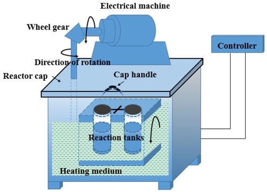 The digestion process was performed in a self-designed reactor equipped with four 150 mL stainless steel pots that rotate in a molten salt bath (Figure 1). The molten salts included sodium nitrate, potassium nitrate and sodium nitrite. Synthetic pregnant liquor was prepared by dissolving sodium hydroxide and aluminum hydroxide in deionized water. The pregnant liquor and the non-magnetic material were transferred into the pots before digestion in which the sealed pots were immersed in the bath with the specified temperature. The reactor was rotated at 30 rpm. After digestion, the sealed pots were taken out and cooled to 80–90 °C with the cooling rate of 20 °C/min, then the suspension in pots was immediately separated and the residue cake was washed using hot water (about 80–90 °C). The dried residue was collected for determination of chemical composition.