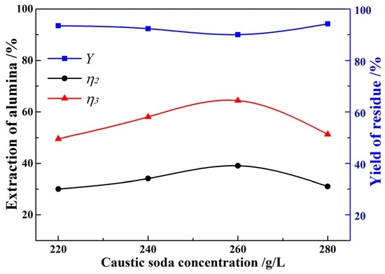 The caustic soda concentration and caustic ratio in pregnant liquor strongly influence the digestion of alumina in the Bayer process. Generally, a high caustic ratio and caustic soda concentration are beneficial to the alumina digestion, because of the unsaturation of Al2O3 in the pregnant liquor. The effect of the caustic soda concentration on the alumina digestion in the non-magnetic material was verified, and the results are shown in Figure 2. The other conditions were kept at the digestion temperature of 240 °C, the digestion time of 60 min, the caustic ratio of 3.0 in the pregnant liquor, and the liquid-to-solid ratio of 4.0 mL/g. The results indicate that the alumina digestion from the non-magnetic material increases first and then decreases with the increasing caustic soda concentration. The digestion of alumina reaches a maximum at the caustic soda concentration of 260 g/L. Note that there is a small difference in alumina digestion when the caustic soda concentration varies between 240 g/L and 260 g/L.