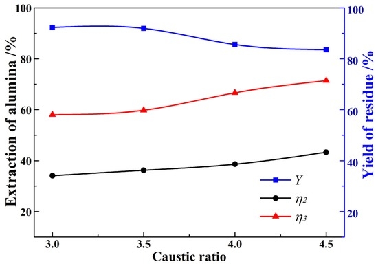 The effect of the caustic ratio on the alumina digestion was also examined. The conditions were a caustic soda concentration of 240 g/L in the pregnant liquor, a digestion temperature of 240 °C, a digestion time of 60 min, and a liquid-to-solid ratio of 4.0 mL/g. As shown in Figure 3, increasing the caustic ratio has a favorable impact on the alumina digestion. The relative digestion ratio of alumina improves from 58.08% to 71.43% when the caustic ratio increases from 3.0 to 4.5. Meanwhile, the yield of red mud decreases from 92.30% to 83.56%.