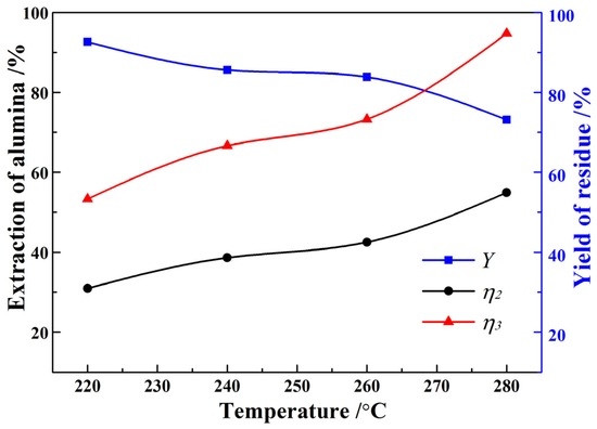 As seen from Figure 4, the alumina digestion increases significantly when the temperature increases. Only 30.93% of alumina is digested from the non-magnetic material at 220 °C, with the yield of red mud exceeding 92.6%, indicating the precipitation of sodium aluminosilicates instead of the digestion of alumina during the digestion process. However, the relative digestion ratio of alumina increases from 53.35% to 94.72% when the temperature varies from 220 °C to 280 °C. With the increasing digestion temperature, more alumina is dissolved in the pregnant liquor, and the yield of red mud reduces significantly. However, generally, it is impractical to use a too-high digestion temperature in the view of energy consumption and preparation.