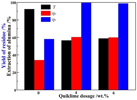 Lime is widely applied in the Bayer process for improving the digestion efficiency. The effect of the addition of lime on the digestion of the non-magnetic material was investigated. The other experimental parameters were a digestion temperature of 240 °C, a digestion time of 60 min, a caustic soda concentration of 240 g/L with a caustic ratio of 3.0 in the pregnant liquor, and a liquid-to-solid ratio of 4.0 mL/g.