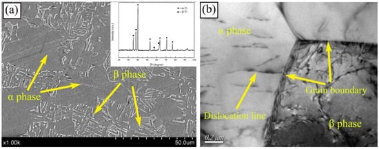 The SEM observation of the duplex Ti-6Al-4V alloy prior to LSP is shown in Figure 2a. The annealed Ti-6Al-4V alloy has a coarse duplex microstructure comprising a primary α phase surrounded by a β phase flake [11,12], as confirmed by the XRD pattern at the upper right corner of Figure 2a. Meanwhile, the primary α phase is mainly featured by its equiaxed morphology. In Figure 2b, the typical bright field (BF) TEM image of the original sample indicates that there are no obvious defects in the primary α and β phases. As shown in Figure 2b, few dislocation lines are observed in the coarse-grained Ti-6Al-4V alloy at the annealed condition.