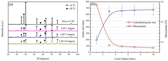 Figure 3a presents the XRD patterns with different LSP impacts. As shown in Figure 3a, there is no additional peak after different LSP impacts, which indicates that no phase transformation occurred and no new crystalline phase was generated, and the main phases are still α and β after laser peening. The severe plastic deformation induced by LSP could result in the increase of microstrain and dislocation density in the material surface, which further contributed to grain refinement. As revealed in the XRD patterns, a dramatic broadening of Bragg diffraction peaks occurred at a different number of impacts, which contributed from grain refinement and the presence of high-level microstrain [20,21].