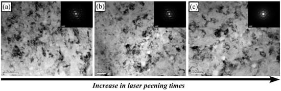 where FW is the broadening of diffraction peaks, K is the shape factor of the lattice constant (1.89), λ is the wavelength of the X-ray radiation (λ = 0.1542 nm), d is the average grain size, ε is the microstrain, and θ is the Bragg angle. As shown in Figure 3b, micro-strain rises, while the grain size decreases with the increase in the number of laser impacts. The grain size reached a sub-micron level when the number of laser pulse impacts exceeds 3. The main reason is that the ultra-high strain rate deformation induced by LSP generates high-density dislocations; moreover, as plastic deformation intensifies, the annihilation and recombination of dislocations lead to the transformation from dislocation walls to grain boundaries, which separates individual grains in the shocked surface. In the next section, more microstructure observations are presented based on transmission electron microscopic analysis to more clearly indicate the microstructure changes near the LSP surface.