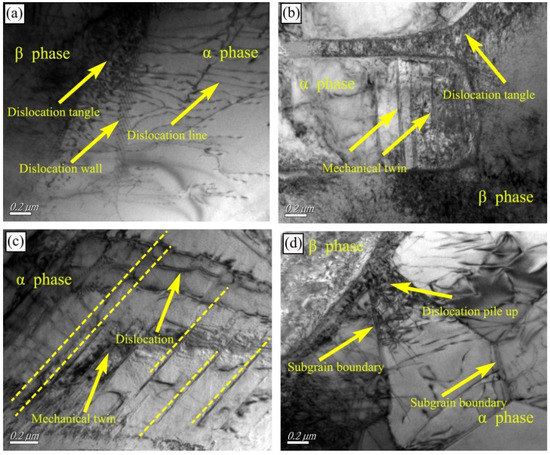 α and β phases with different atomic arrangements co-exist in the Ti-6Al-4V, and these two phases exhibit different microstructure characteristics during LSP. In Figure 5, TEM images at a depth of about 15–20 μm from the shocked surfaces with different numbers of impacts are presented to understand the microstructure characteristics. Under a single impact, a high density of dislocation tangles was observed in the β phase, while relatively low density was observed in the α phase, as shown in Figure 5a. The β phase with a body-centered cubic (bcc) crystal structure has high stacking fault energy and more slip systems, so dislocation multiplication is easily achieved in this phase. The dislocations in the α phase exhibit regular configuration with distinguishable dislocation lines. Moreover, dislocation walls were formed in the α phase after the single impact, which would further develop toward the sub-grain boundary as plastic deformation intensifies. In Figure 5b, dislocation density in the β phase kept increasing, and some mechanical twins appeared in the α phase after three impacts. The α phase of the Ti-6Al-4V alloy has a hexagonal close-packed (hcp) crystal structure, and only four independent slip systems are available in the α phase. According to the Von-Mises rule, five independent slip systems are necessary to maintain plastic deformation compatibility [24,25,26]. Therefore, hcp metals usually need other deformations, such as twinning, to accommodate the plastic deformation. Detailed TEM observations in Figure 5c show that high-density twin lamellas with a thickness of several nanometers were formed after five impacts with the laser energy of 7.9 J in the α phase. Furthermore, dense dislocations gathered in the twin boundaries and divided the twins into finer blocks by the twin and dislocation intersections. In Figure 5d, the sub-grain boundaries formed in the α phase after 10 impacts and divided the coarse grains into sub-grains with sizes of 200–300 nm. However, there was still a high density of dislocations inside the sub-grains. The movement of these dislocations were impeded by the phase and grain boundaries, and piled up near these boundaries.