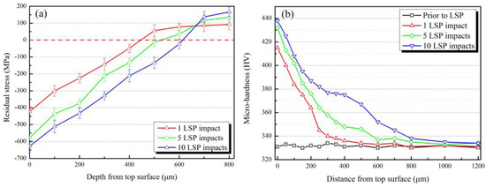 (a) Residual stress and (b) micro-hardness distribution on cross section with different LSP impacts.