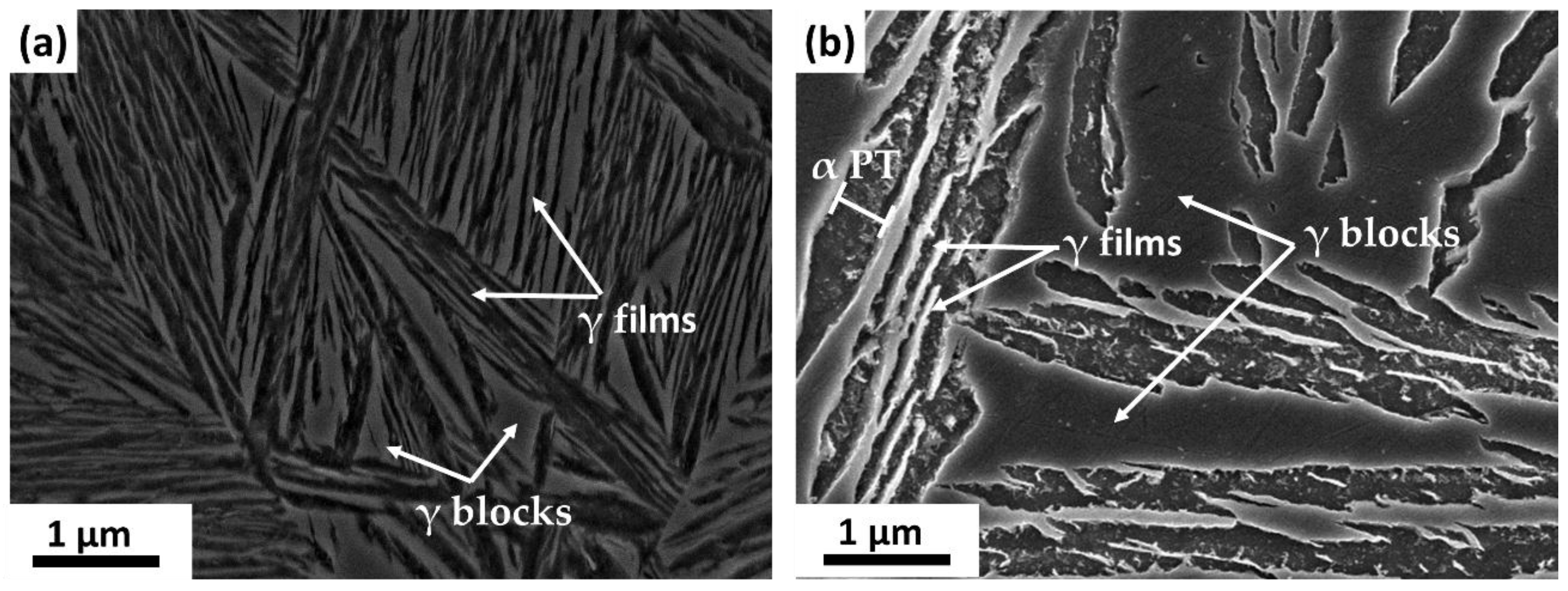 Secondary-electron scanning electron micrographs (SE-SEM) of two nanostructured bainites from the same steel, with chemical composition in reference [15], treated at 250 °C (a) and 350 °C (b). γ stands for austenite, and α PT, for bainitic ferrite plate thickness.
