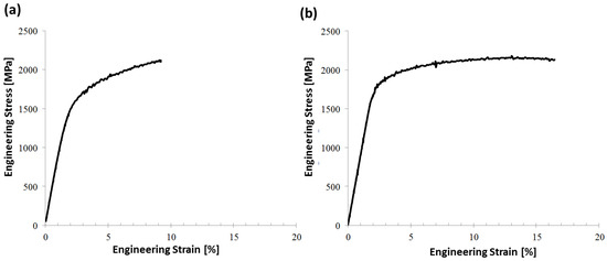 Engineering tensile strain-stress curves of two nanostructured bainite samples from different steels, both containing 1C–1.5Si wt %, but steel in (a) having 2Mn wt % and steel in (b) having 0.9Mn–2.6Ni wt % instead. Adapted from reference [37].