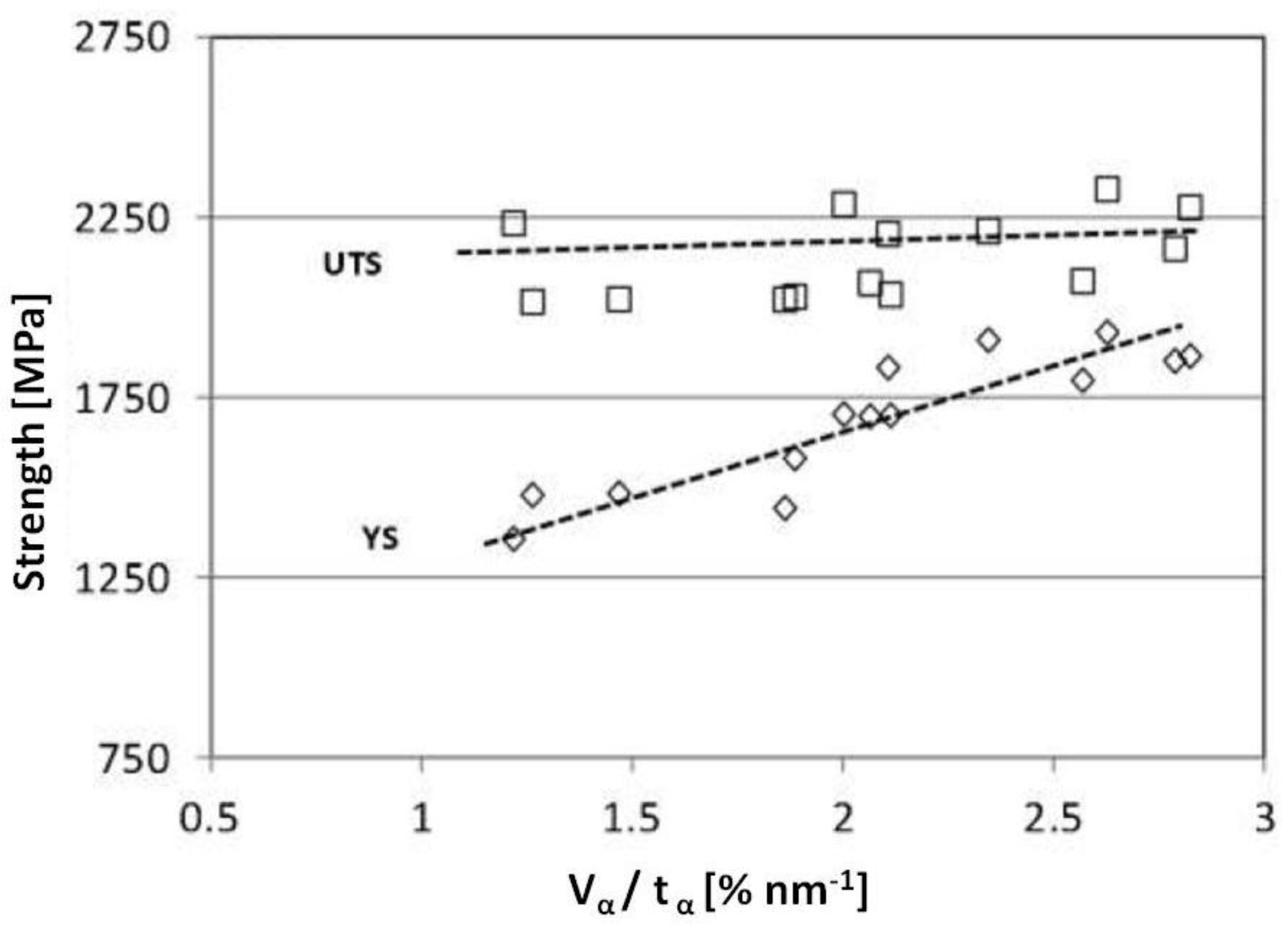 Ultimate tensile strength (UTS) and yield strength (YS) of different nanostructured bainites as a function of the ratio Vα/tα. Adapted from reference [42].