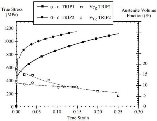 There is no doubt that the role of retained austenite is a topic of paramount concern. However, changes in the initial fraction of retained austenite and its stability cannot be easily made without altering other factors. In this sense, the coupling between plasticity and the mechanically induced transformation is complex, often without a clear distinction between cause and effect [70]. As already seen, there seems to be a correlation between plastic strain and the austenite fraction evolution, but it is not straightforward to know the extent at which the austenite evolution occurs as a consequence of the stress-strain behavior, or how instead this transformation affects the work hardening. In addition, Equation (3) is an empirical law which does not necessarily imply that the plastic deformation governs the austenite evolution, that is, stress-assisted martensitic transformation cannot be ruled out.