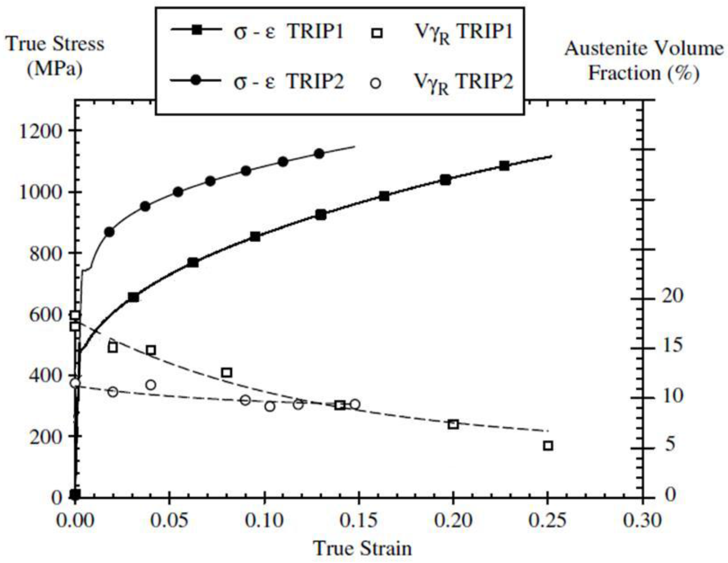 Two examples of the tensile response of two typical transformation induced plasticity (TRIP) aided steels and their corresponding austenite fraction evolution. Adapted from reference [47].