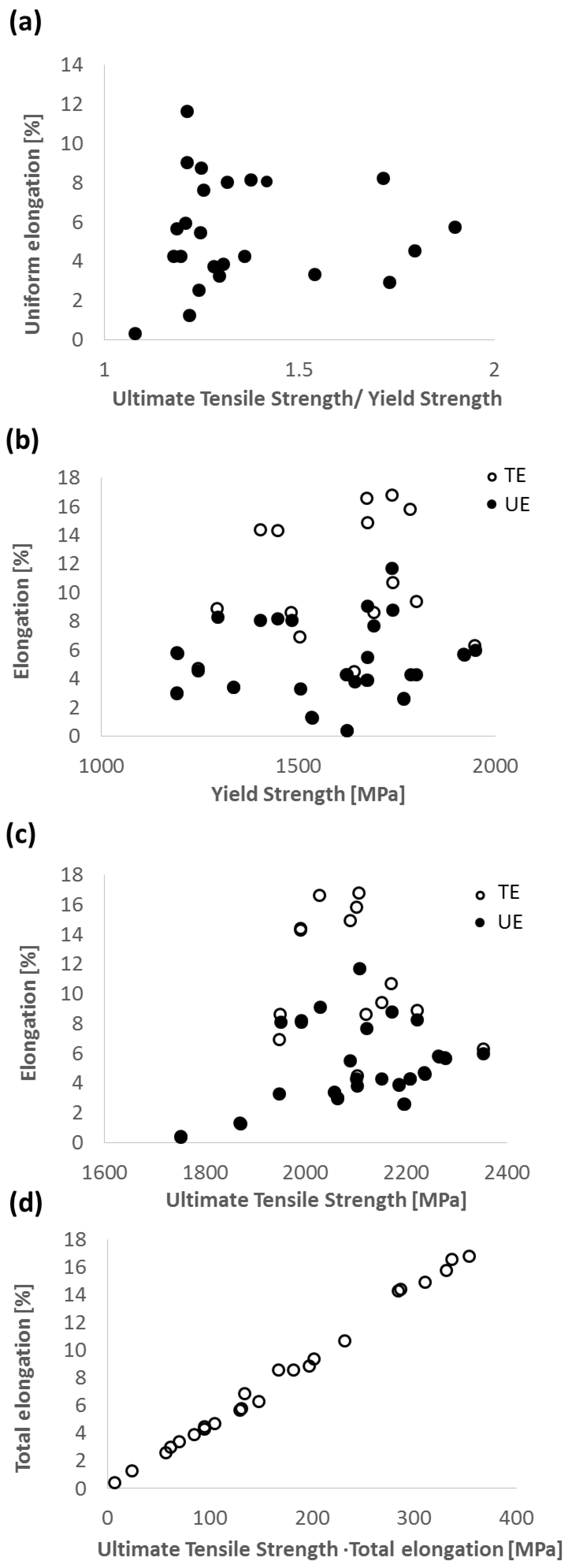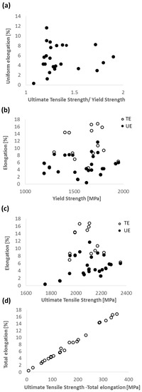 Correlation between strength and elongation (TE, total elongation; and UE, uniform elongation) parameters of different nanostructured bainites, from data from reference [53]. (a) UE vs. the ratio between ultimate tensile strength and yield strength; (b) elongation (TE and UE) vs. yield strength; (c) elongation (TE and UE) vs. ultimate tensile strength; (d) TE vs. the product between TE and ultimate tensile strength.