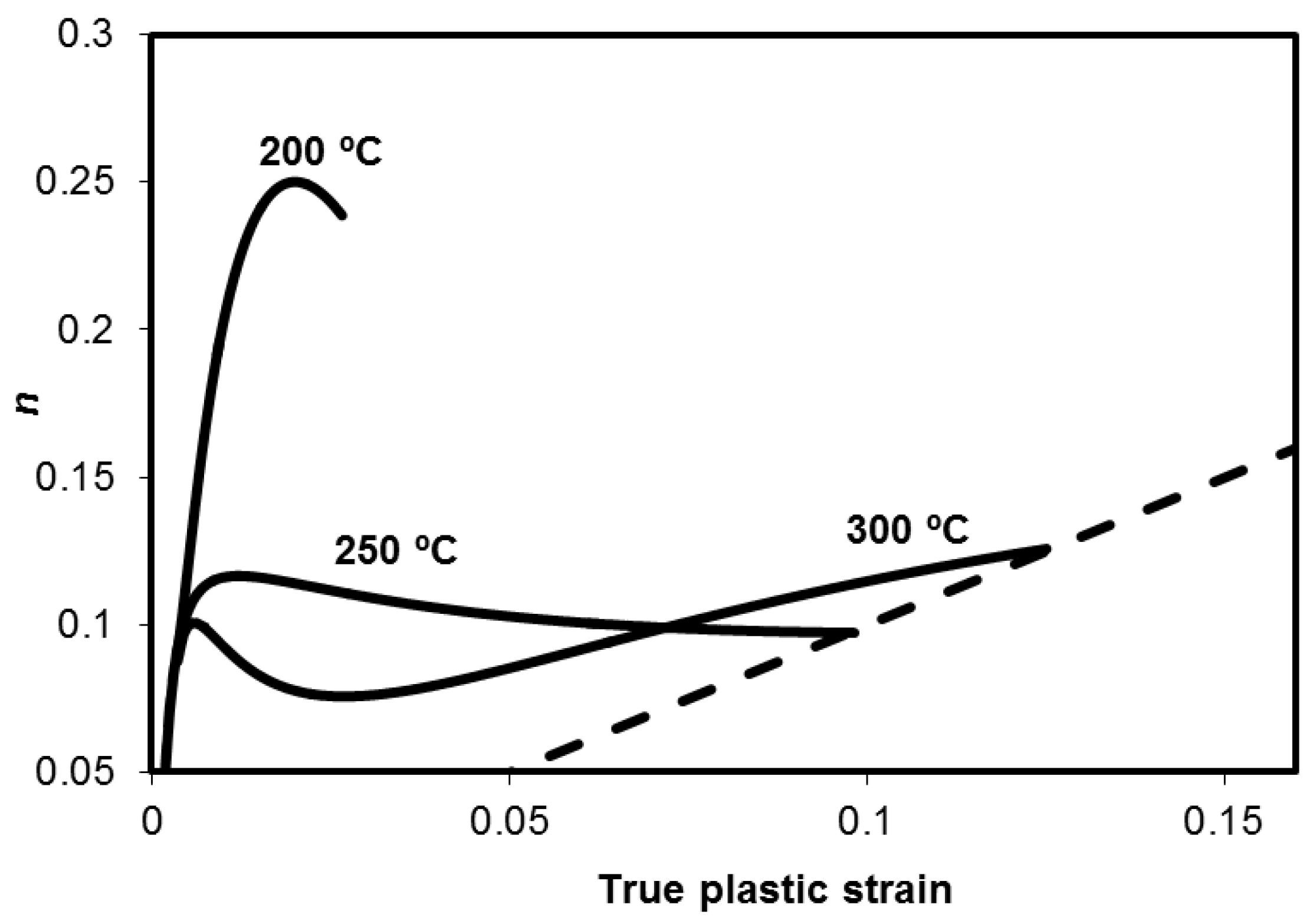 Evolution of the incremental work-hardening exponent, n, as a function of the true plastic strain, of three nanobainitic structures treated from the same steel treated at three different temperatures, 200, 250, and 300 °C. Adapted from reference [57].