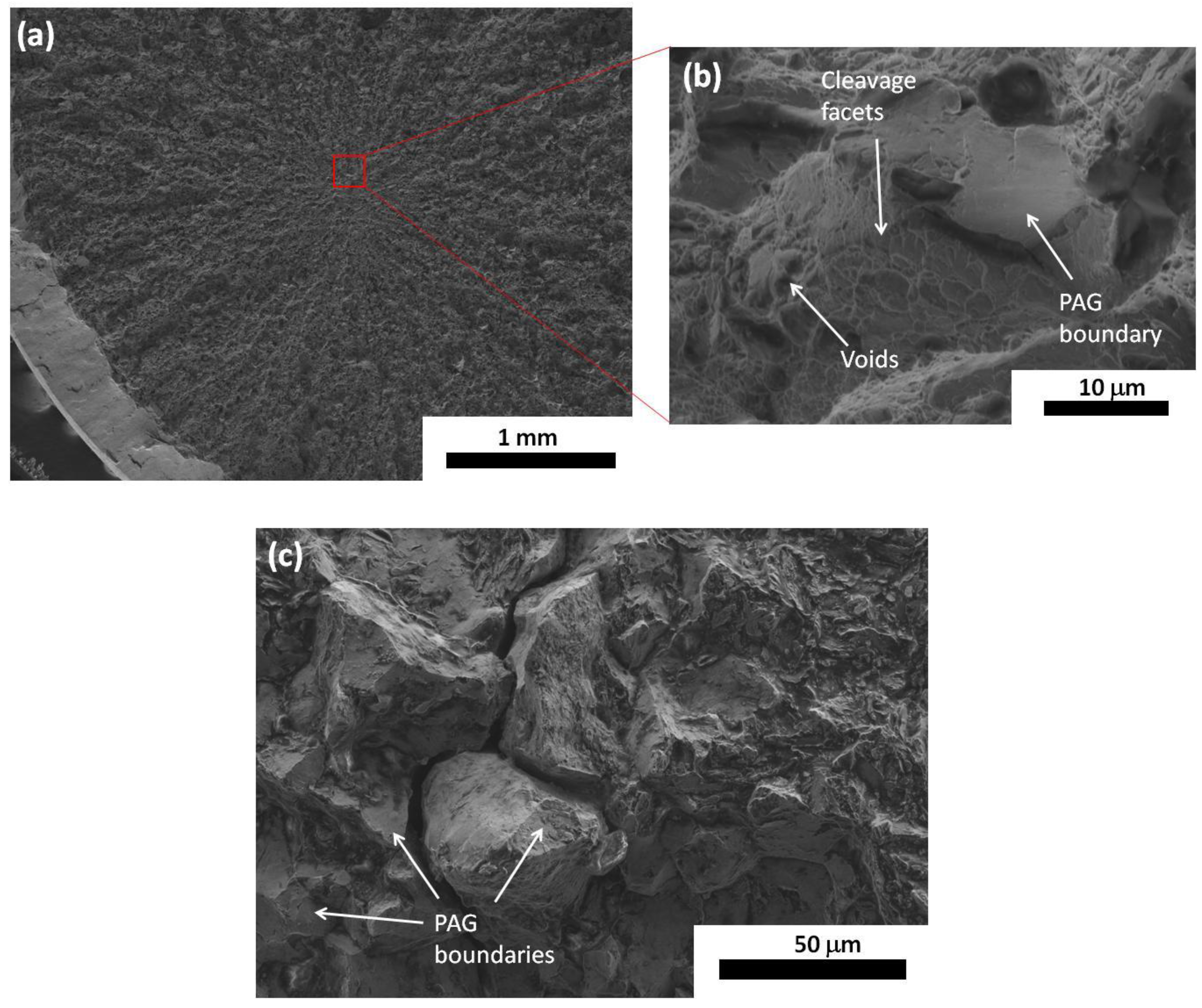 Regarding the fracture analyses of the tensile-tests of nanostructured bainite, Figure 7, tear ridges are revealed, which converge at a unique site within the specimen section, closer or further from its center, but beneath the surface, ruling out influence of the machining process. There are always signs of intermixed fracture mechanisms, both ductile and brittle: voids, cleavage facets and intergranular fracture at prior austenite grain (PAG) boundaries [54], Figure 7. Cracks in low-ductility tensile specimens have not been found to originate at inclusions or coarse precipitates, but there seems to be a prevalence of fragile fracture, from the observation of large extensions of PAG boundaries on the fracture surface (as in Figure 7c, corresponding to a microstructure with a total elongation of 7%) [54]. In quenching and partitioning (Q&P) steels, which consist of a matrix of tempered martensite plus C-enriched retained austenite, it has been reported that the transformation of retained austenite into high-C martensite may lead to the decohesion of PAG boundaries. However, in this case, dimple fracture at the PAG boundaries has also been observed [58], as opposed to the fragile failure at the nucleation stage observed in nanostructured bainite. In TRIP-assisted steels, on the other hand, it is known that the mechanical stability of the austenite is a critical factor on crack propagation, since the brittle martensite increases the susceptibility to hydrogen embrittlement [59,60,61,62].