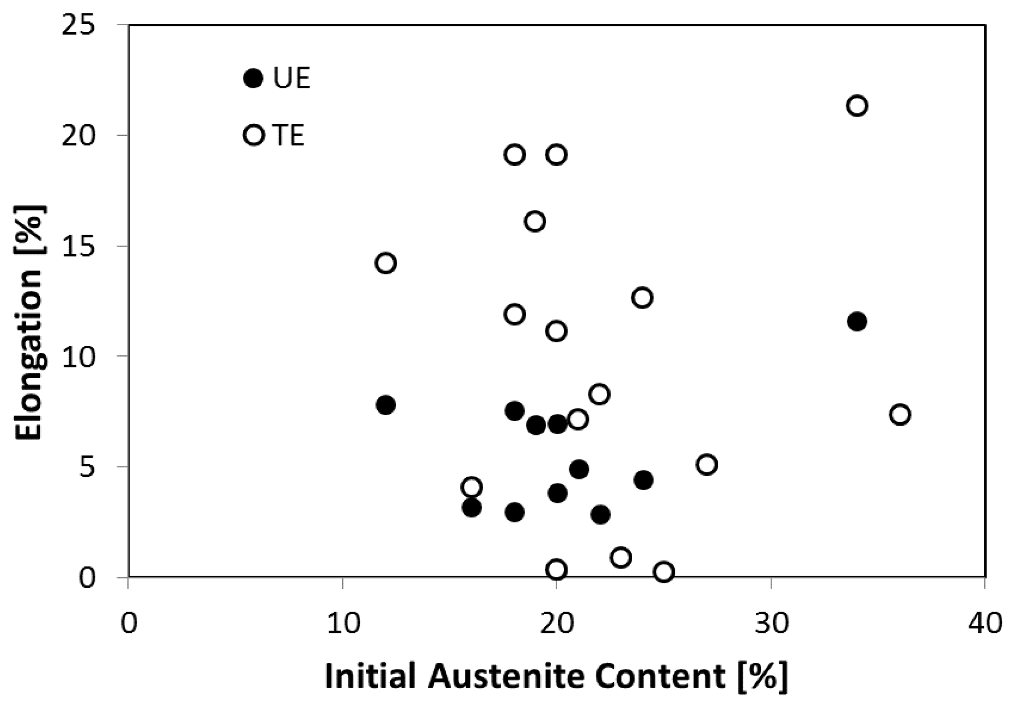 Values of total and uniform elongation, TE and UE, respectively, vs. the initial austenite content. Adapted from reference [9,42].