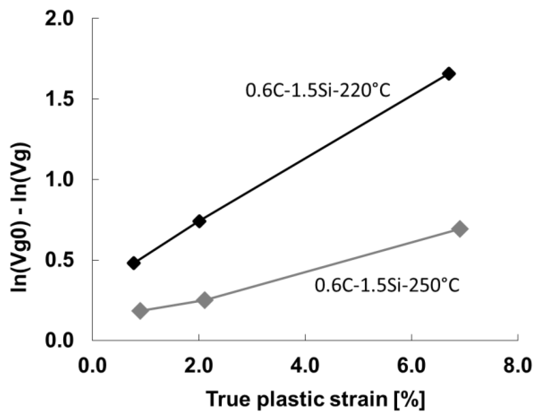 where ε is the true plastic strain at the uniform elongation region of the tensile test; is the initial volume fraction of austenite at zero strain; VFγ is the volume fraction of austenite at a strain ε, and K is a fitting parameter that depends upon the material and the test temperature in the tensile test. This parameter K reflects the stability of the retained austenite: the higher the value, the greater the quantity of retained austenite is destabilized for a given increase in plastic strain.