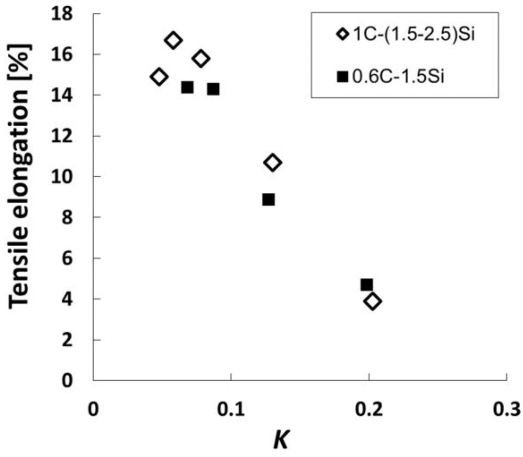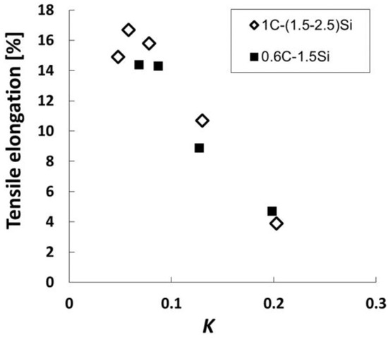 Tensile elongation vs. K, the fitting parameter of Equation (3), for different nanobainitic structures, from steel containing 0.6 and 1 C wt %. Adapted from references [53,66].