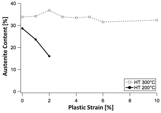 Evolution of austenite content, measured by neutron diffraction, as a function of the plastic strain during a tensile test, for two nanobainitic structures from the same steel after customized isothermal treatments at 200 and 300 °C. Adapted from reference [69].