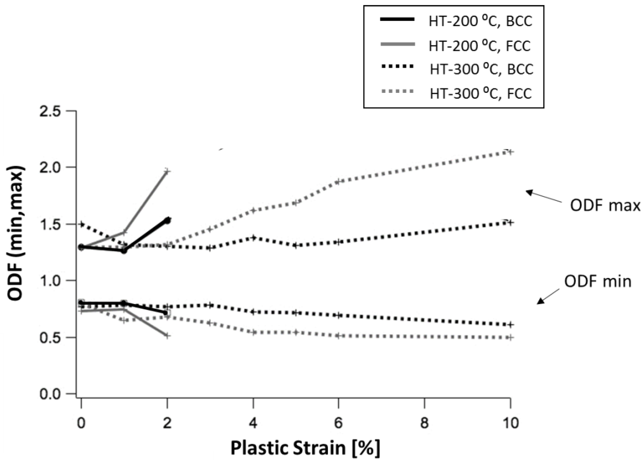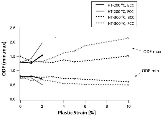 Results in Figure 10 are in good agreement with those given by another study [69] in which two samples subjected to interrupted tensile tests were analyzed by neutron diffraction. In the mentioned work, the two nanobainitic structures were obtained from the same alloy, after isothermal treatment each at a different temperature, 200 °C and 300 °C, whose duration was tailored in order to obtain the same initial austenite content, 35%. The sample treated at the highest temperature did not present mechanically-induced martensitic transformation, and its uniform elongation was outstanding, 10%, in comparison to the sample treated at 200 °C, which fractured at a plastic strain of 2%, Figure 11. For the low-ductility sample, the austenite content strongly decreased with deformation, which resulted in an important crystal texture formation, due to the high sensitivity of the martensitic transformation to the crystal orientation. The texture formation is illustrated in Figure 12, where the maximum and minimum values of the orientation distribution function (ODF) intensity are plotted as a function of the plastic strain. In the case of the high-ductility sample, the texture evolution, although lower, was not negligible. This fact revealed the occurrence of plastic crystal rotation of both austenite and bainitic ferrite, which suggests that this deformation mechanism can be behind the beneficial work-hardening behavior of the ductile samples, explained previously. That is, the martensitic transformation does not seem to be responsible of the rise of the incremental work-hardening exponent, n, that effectively delays the necking as was observed in Figure 6.