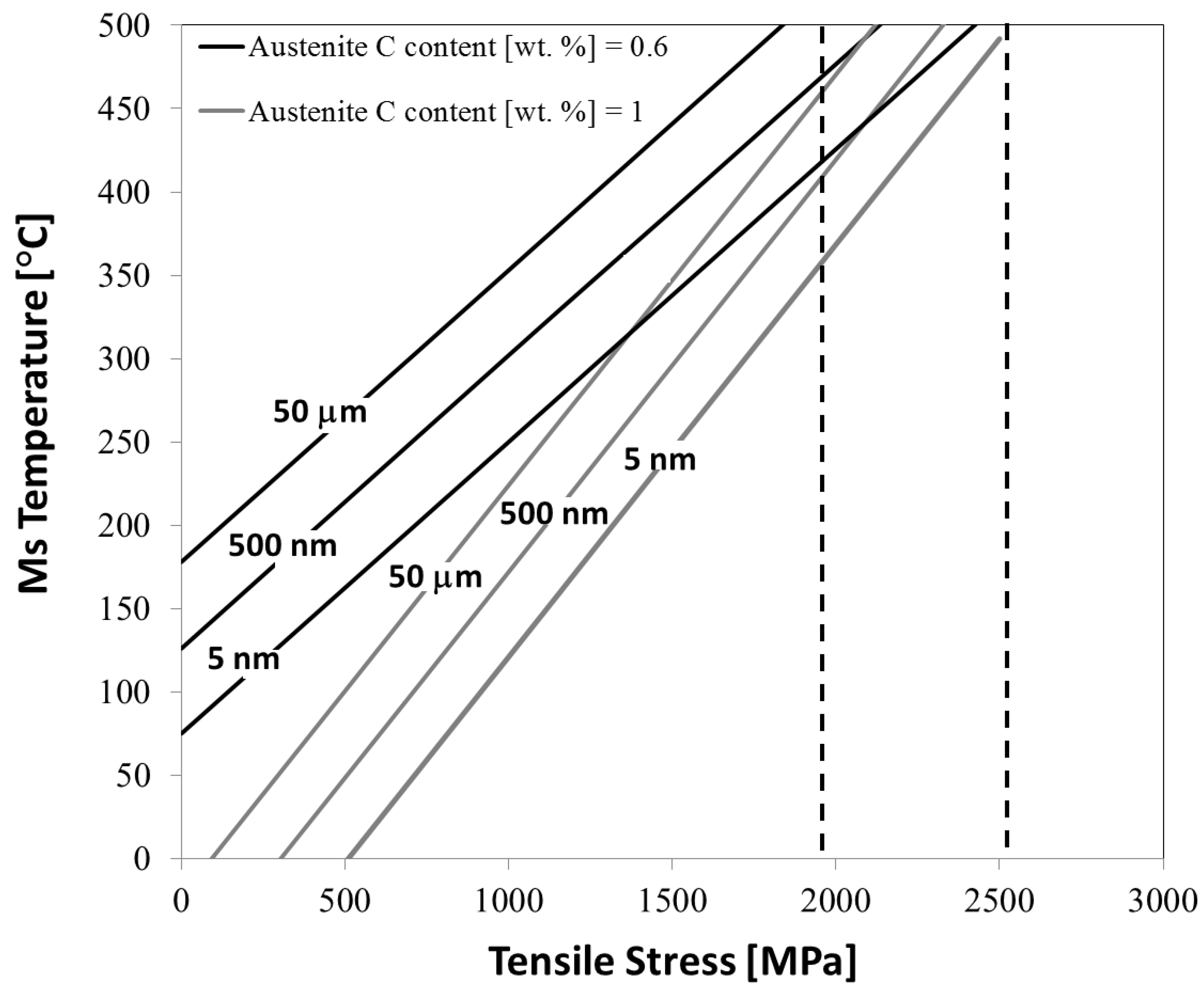 Theoretical values of Ms (solid lines) as a function of the retained austenite C content, the austenite feature size, and the overall tensile stress, for the steel described in reference [54]. The dashed lines delimit the experimental tensile stresses over the TEM-analyzed cross sections. Adapted from reference [54].