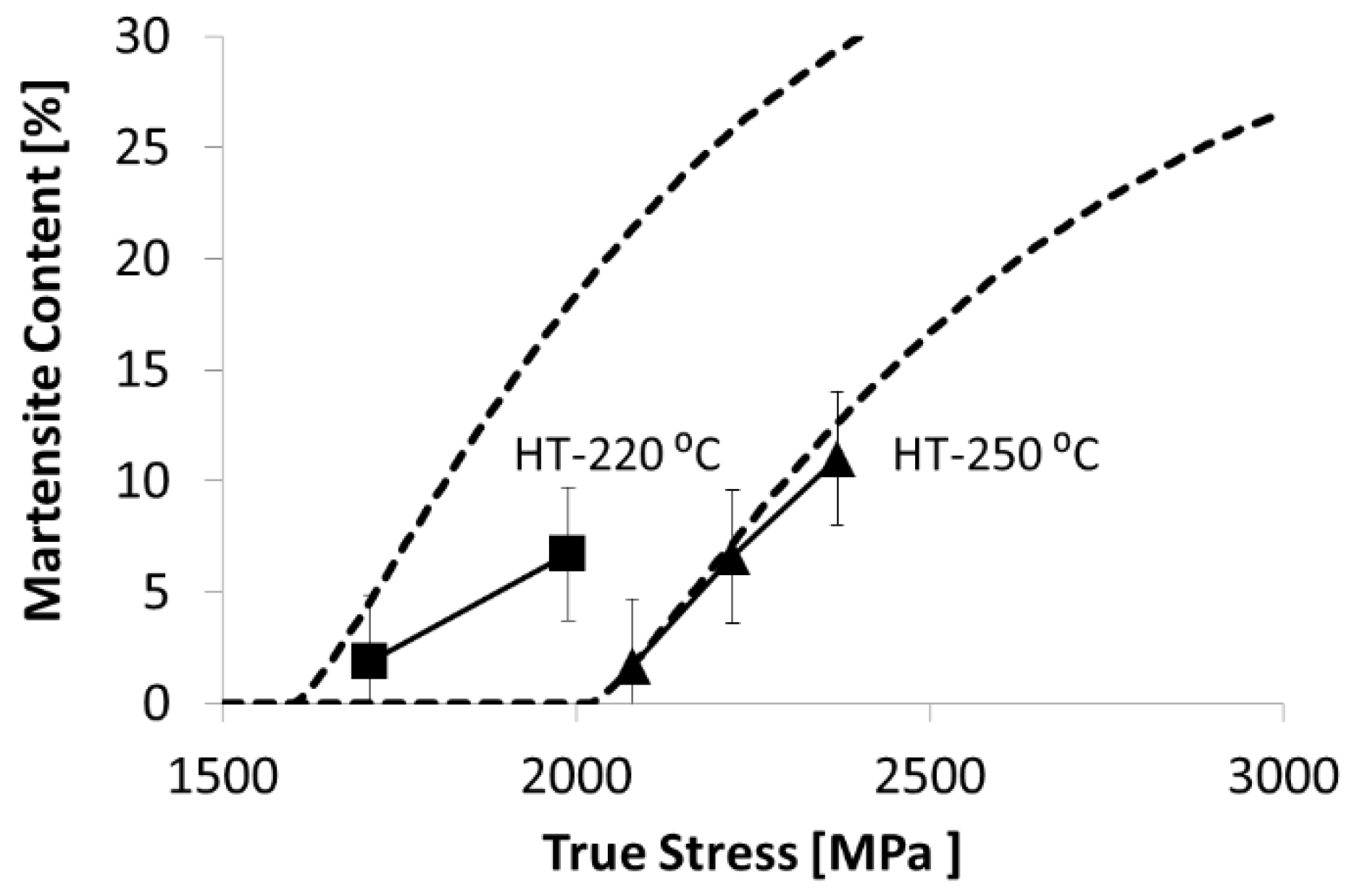Experimental results (solid symbols) for the martensite content evolution as a function of the true stress of tensile test, and predicted values (dotted lines) according to the procedure mentioned in the main text, for two nanobainitic structures from one steel treated at 220 and 250 °C. Adapted from reference [73].