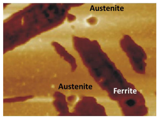 It has been suggested that a small mechanical mismatch between the phases in samples treated at high temperatures can be the reason behind improved ductility [54,73]. In other words, there seems to be, on one hand, a tendency to reduce the strength of the bainitic ferrite as the treatment temperature increases which can be justified by its lower C content and the decrease of defect content. On the other hand, the higher observed C content of retained austenite as the treatment temperature increases might contribute to enhance its strength, which becomes closer to the bainitic ferrite values or even exceed them. In order to confirm that possibility, local mechanical measurements in the phases present in the initial microstructure were performed by means of AFM (atomic force microscopy)-based nano-indentation, as shown in Figure 15 [15], where the phase indentation, either a plate of bainitic ferrite or an austenite feature, is clearly identified.