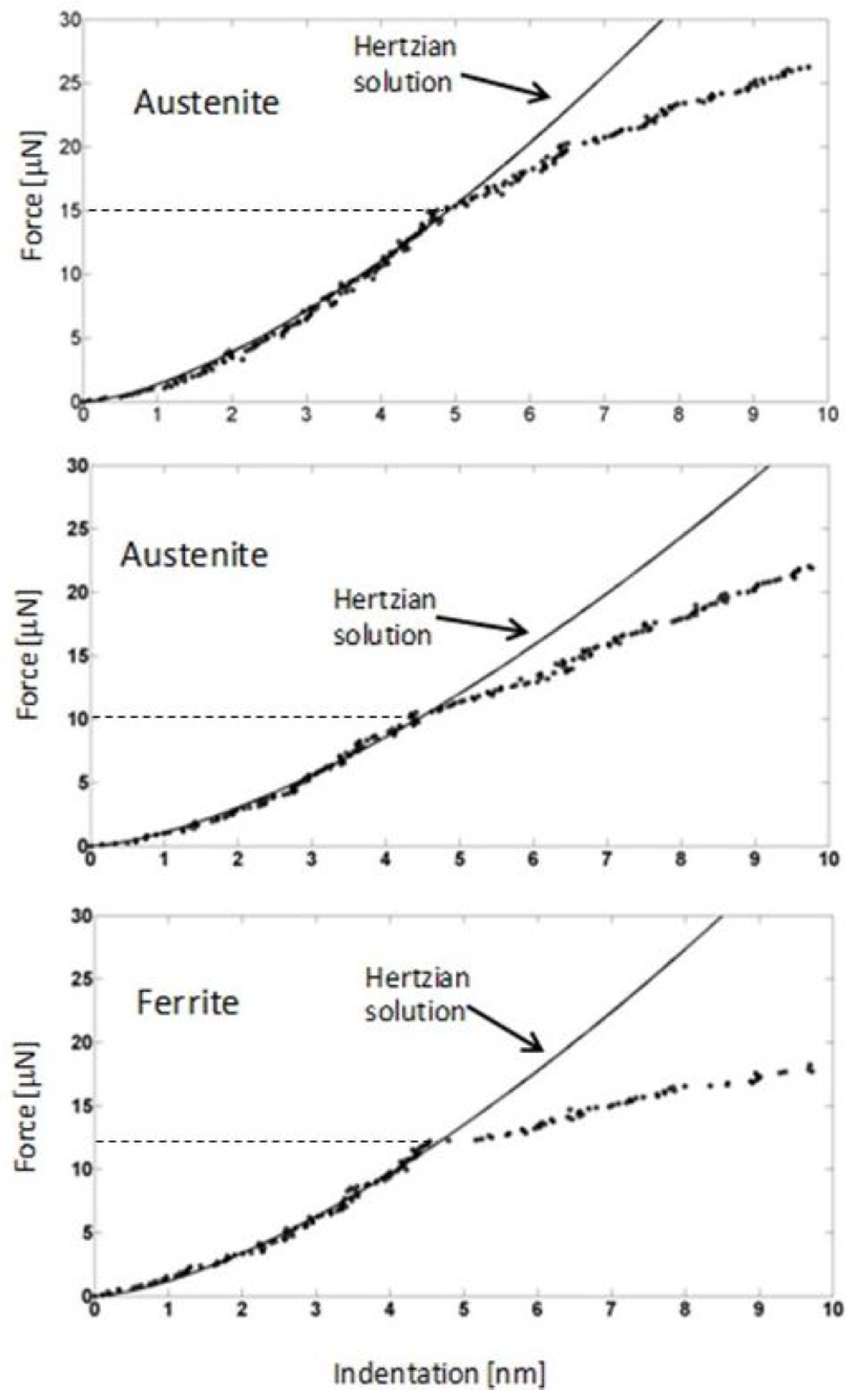 Approach force curves obtained by AFM-based nano-indentation in either bainitic ferrite or austenite, in a nanobainitic structure treated at 300 °C, described in reference [15].