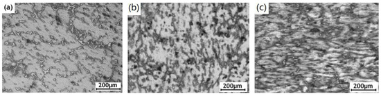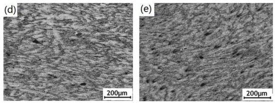 Figure 1 presents micrographs of the ECAPed AZ91D alloy with various passes. Ternary Mg–Al–Zn alloys, with the Al/Zn ratio of larger than 3:1, generally consist of a hexagonal-close-packed-structure solid solution (the α-Mg phase with Al) and an intermetallic compound (the β-phase with a stoichiometric composition of Mg17Al12) [21]. The typical microstructure of the as-cast AZ91D alloy (Figure 1a) was characterized by the presence of the primary α-Mg phase and the divorced eutectic β-phase (Mg17Al12) distributed along the α-Mg phase grain boundaries. It can be seen that the initial CG microstructure was severely deformed after multi-pass ECAP. With the ECAP pass increasing, the primary α-Mg matrix and the divorced eutectic along α-Mg grain boundaries were distorted and elongated with the plastic flow along the shear direction. Meanwhile, the continuous and coarse β phase along the α-Mg grain boundaries was gradually stretched, broken and refined because of severe shear strain (imposed about 1.1 after one pass [22]). Those imposed strains during repetitive ECAP also led to many crystalline defects (such as grain boundaries and intragranular dislocation). After ECAP for 12 passes, the sample had a homogeneous, fine-grained microstructure with homogeneously distributed and small β-phase particles. After ECAP for 16 passes, the grain size of the α-Mg matrix decreased from 200 μm to 1–2 μm and the ultra-fined microstructure was obtained. Meanwhile, the original coarse net-like β-phases (as shown in Figure 1a,b) were completely refined to smaller particles with the size of approximate 7 μm and homogenously distributed in the UFG α-phase matrix (Figure 1e). Our previous TEM investigation presents a more detailed microstructure characterization of the UFG AZ91D alloy after 12 ECAP passes [9]. The ultrafine grains were divided into smaller subgrains while abundant dislocations were stored in the deformed grains. During the multi-pass ECAP process, the dislocations would continuously evolve into dislocation tangles, dislocation cells, dislocation walls and sub-grain boundaries, finally forming new grain boundaries to create new, refined, fine grains with high-angle grain boundaries (HAGBs). The mass of dislocations and HAGBs in the UFG AZ91D alloy, acting as the fast atomic diffusion channels [23], can make its chemical activity higher than that of the as-cast alloy.