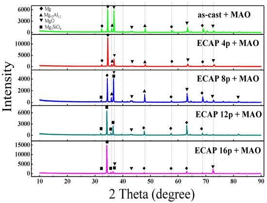 X-ray diffraction patterns of micro-arc oxidation on the as-cast and ECAPed AZ91D magnesium alloys.