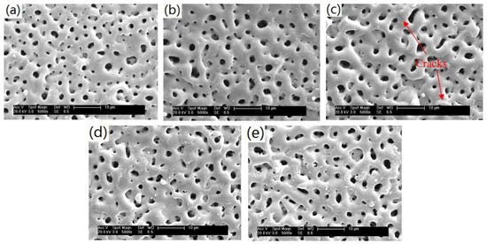 SEM images of the surface of the micro-arc oxidation coatings on (a) the cast AZ91D alloy and the ECAPed ones at 523 K for (b) 4 passes; (c) 8 passes; (d) 12 passes and (e) 16 passes.