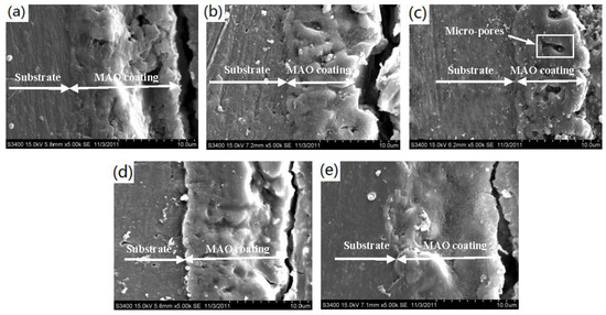 SEM images of the cross-section morphology of the MAO coatings on (a) cast AZ91D alloy and ECAPed AZ91D alloys at 523 K with (b) 4 passes; (c) 8 passes; (d) 12 passes and (e) 16 passes.