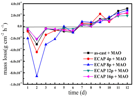Figure 5 illustrates the mass loss of the coated samples during immersion in 3.5% NaCl solution. At the initial immersion stage (about 1–2 d), the mass of each sample increases and the mass gain of the 8-pass sample is biggest. It results from the adhesion of corrosion products on the wall side of the micro-pores in the MAO coating. The existence of corrosion products can prevent the Mg substrate from direct contact with the electrolyte through the unclosed micro-pores. At the following stable stage (2–6 d), the formation rate of corrosion products and the solution rate of the MAO coating was approximately similar. After immersion for about 7 days, the mass loss happened because the MAO coating and the matrix were corroded. With the increase of immersion time, the coating and corrosion product exfoliated from the samples. During the whole immersion testing, the corrosion rate of the MAO coating on UFG AZ91D is lower than that of the as-cast sample. This indicates that the MAO coating on the UFG AZ91D alloy has better corrosion resistance and protection.