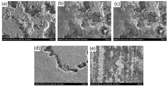 SEM morphologies of the broken MAO coatings on the as-cast and ECAPed AZ91D samples immersed in 3.5 wt % NaCl solution for 4 days: (a) as-cast; (b) 4 passes; (c) 8 passes; (d) 12 passes and (e) 16 passes.