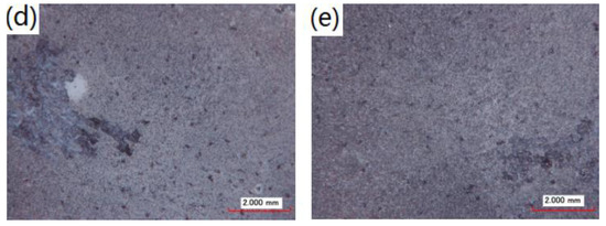 Macro-morphologies of the coated samples immersed in 3.5 wt % NaCl solutions for 12 days: (a) as-cast; (b) 4 passes; (c) 8 passes; (d) 12 passes and (e) 16 passes.