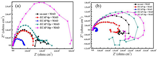 Figure 8 shows Nyquist plots of impedance spectra of the MAO coatings formed on the as-cast AZ91D and the ECAPed ones after immersion in 3.5 wt % NaCl solutions for 30 min and 1 day, respectively. In the initial immersion time (about 30 min), the capacitive-arc diameters of the ECAPed AZ91D alloy for 12 and 16 passes are much larger than that of the as-cast sample. It indicates that the MAO coating formed on the ECAPed Mg substrate is more corrosion resistant than that on the as-cast sample in the initial immersion period. It is obvious that the capacitive-arc diameter of the ECAPed AZ91D increases as the ECAP pass is increased. After immersion for 1 day, capacitive-arc diameters of all samples decreased and an obvious inductive loop appeared, implying the pitting occurrence [29]. The lower capacitive-arc diameter means that the coating corrosion becomes more severe due to the pitting occurrence. The capacitive-arc diameter of the UFG AZ91D with 16 passes was still larger than the as-cast sample, showing that the MAO coating on the UFG AZ91D has better corrosion resistance. Although the corrosion resistance of the coated sample with fewer passes is lower than that of the as-cast sample, the sample with a large number of ECAP passes is more corrosion resistant than the as-cast sample.