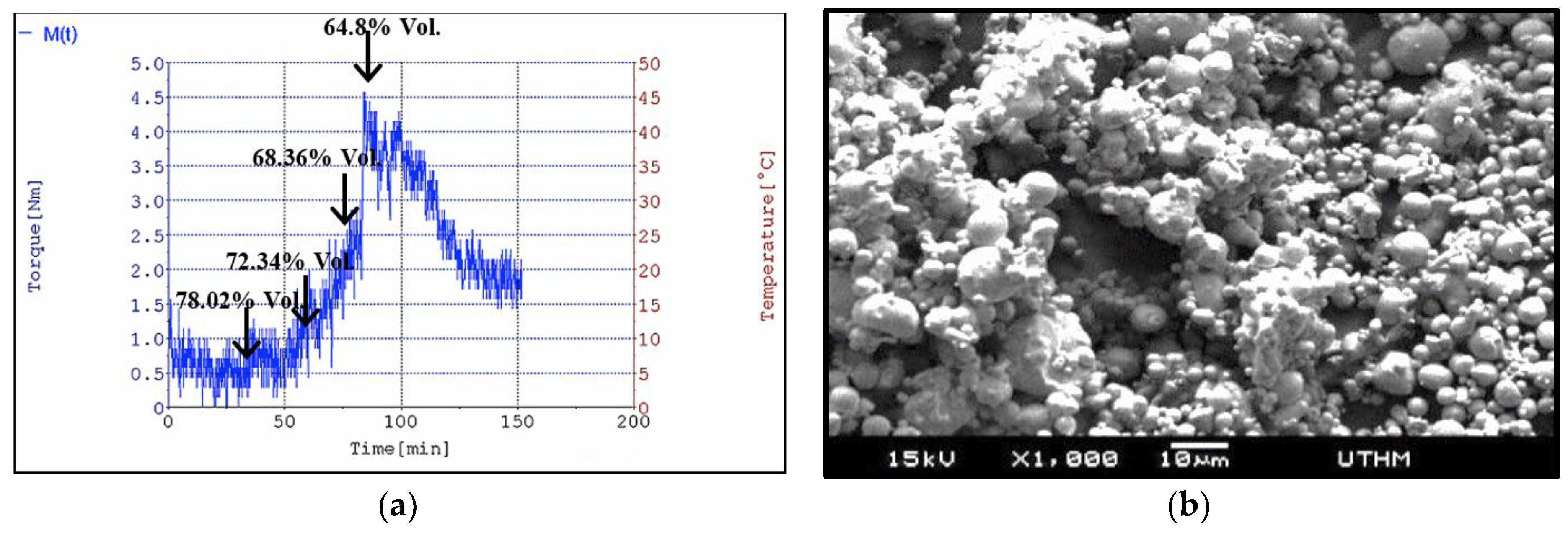 Water atomized 316L stainless steel powder with chemical composition and particle size distribution as shown in Table 1 and Table 2 respectively has irregular shape as revealed in Figure 1b. Particle size distribution is obtained using laser scattering particle analyser FRITSCH Analysette 22 (Universiti Tun Hussein Onn Malaysia (UTHM), Johor, Malaysia) since it is one of the important factors in MIM which influenced the different stages of the MIM process [29]. The selected stainless steel powder is found to have 64.8% Critical Powder Volume Concentration (CPVC) (Figure 1a). CPVC is the point where all the particles are tightly packed and all voids between the particles are filled with binder. The determination of CPVC is important in order to establish the optimum amount of binder in the feedstock. CPVC was experimentally determined by means of oil absorption ASTM D-281-31 method using Thermo Haake Rheomix mixer (Universiti Kebangsaan Malaysia (UKM), Selangor, Malaysia) where 0.5 mL volume of oleic acid was added to 200 g of SS316L powder for every 5 min [30]. If the addition of oil continues, the torque value decreases abruptly indicating that the critical powder volume concentration is reached [31]. Equation (1) is employed to obtain the CPVC using powder volume (Vp) and acid oleic volume (Vo) at the point where the torque is a maximum.