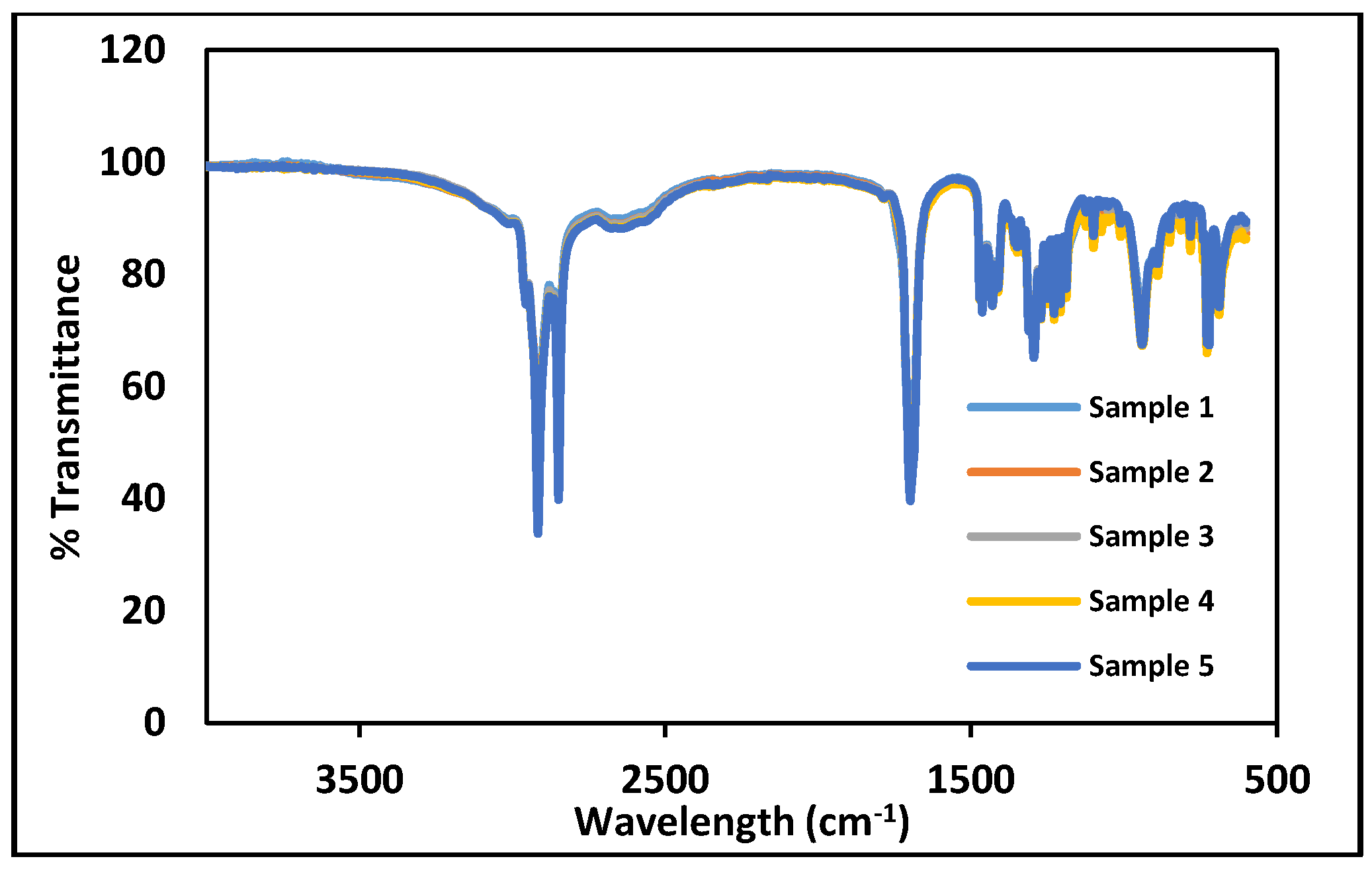 Fourier Transform Infrared (FTIR, UTHM, Johor, Malaysia) was used as a tool to quantify the RWFO received and analysis was done on five samples with different lot of RWFO with the same provider for characterizing the chemical bonds corresponding to various functional groups (Figure 2) [32,33].