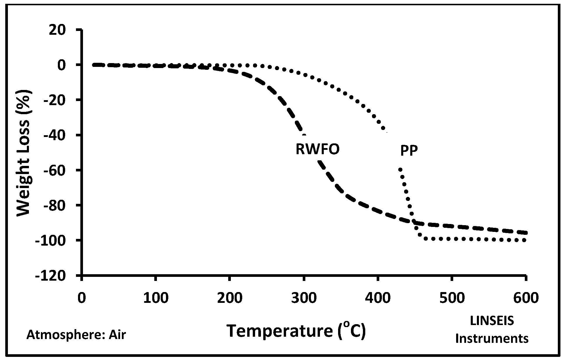 TGA analysis of Polypropylene and RWFO in air atmosphere and heating rate of 10 °C/min to determine degradation temperature of binder constituents.