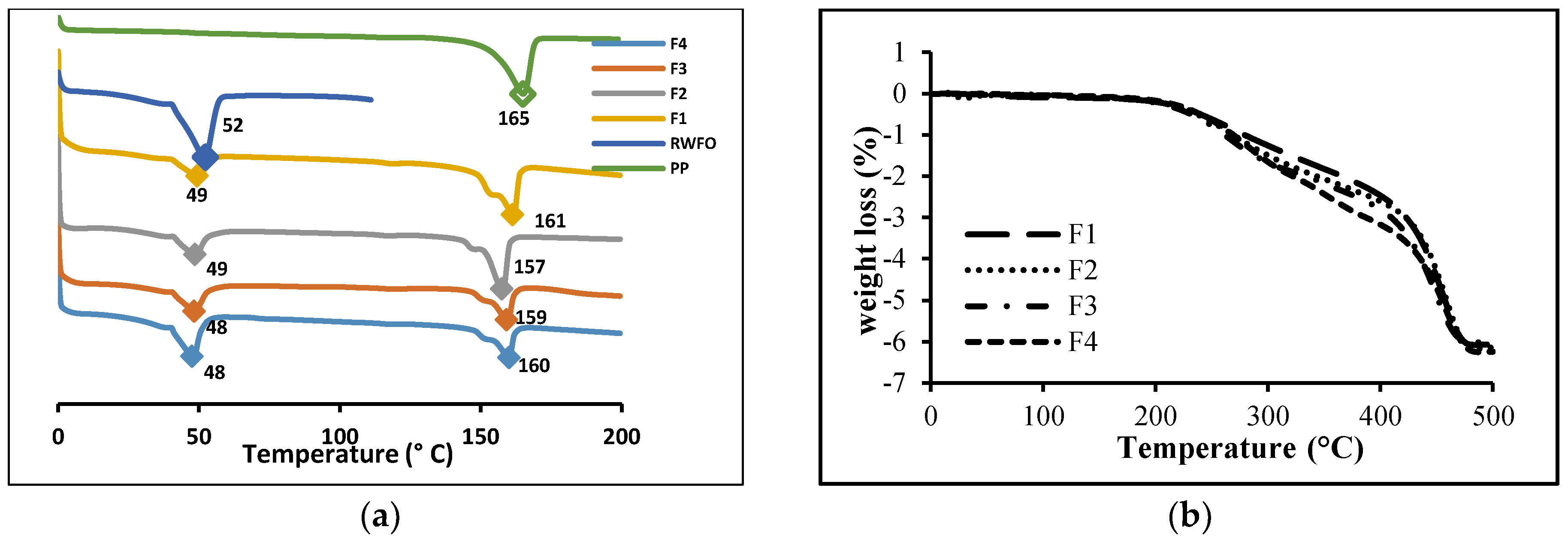 (a) DSC scans of the PP, RWFO and feedstock formulation; (b) TGA profile of different feedstock formulation.