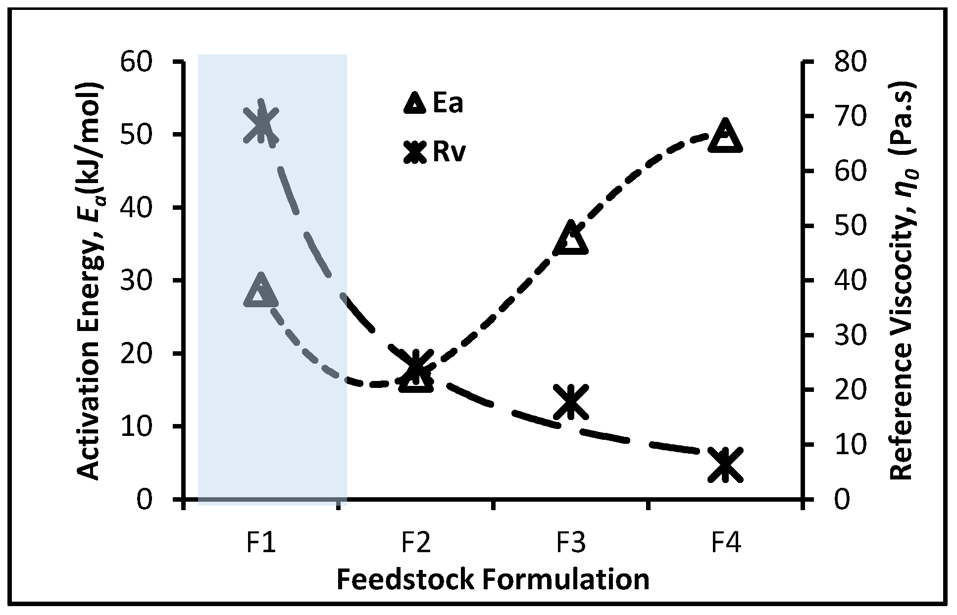 From Equation (3), Ea is the flow activation energy, R is the gas constant, T is the temperature, η0 is the viscosity at reference temperature. If the value of Ea is lower, the viscosity is not so sensitive to temperature variation, which means that any small fluctuation of temperature would not give any sudden viscosity change [37]. The value of Ea/R can be calculated form the gradient of the graph shown in Figure 7. The graph presented in Figure 8 and Figure 9 show the evolution of n, η0 and Ea rheology parameters with variations of feedstock formulation for the reference conditions of 170 °C and 1000 s−1. A shaded region is the sudden variation of all rheological parameters (n, η0 and Ea) occurs at F1–F2 feedstock formulation. This region can be considered as critical feedstock formulation based on the 60% volumetric powder loading. A similar region was found by Hidalgo et al. [38] with critical powder loading but in this case for feedstock formulation. Minimum activation energy is obtained for the F2, being the feedstock less sensitive to temperature variations. This minimum marches with a maximum of the η0 parameter and an inflection point in the value of the flow index.