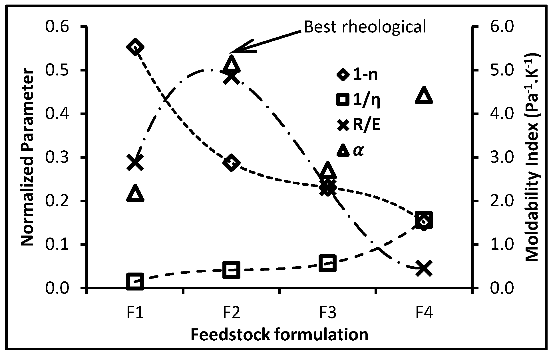 where η0 is the reference viscosity at 170 °C and shear rate of 1000 s−1. Higher value of αstv indicates better feedstock formulation. From Figure 10, F2 shows the better general moldability index and this feedstocks will be injected and be analyzed for solvent debinding variables.