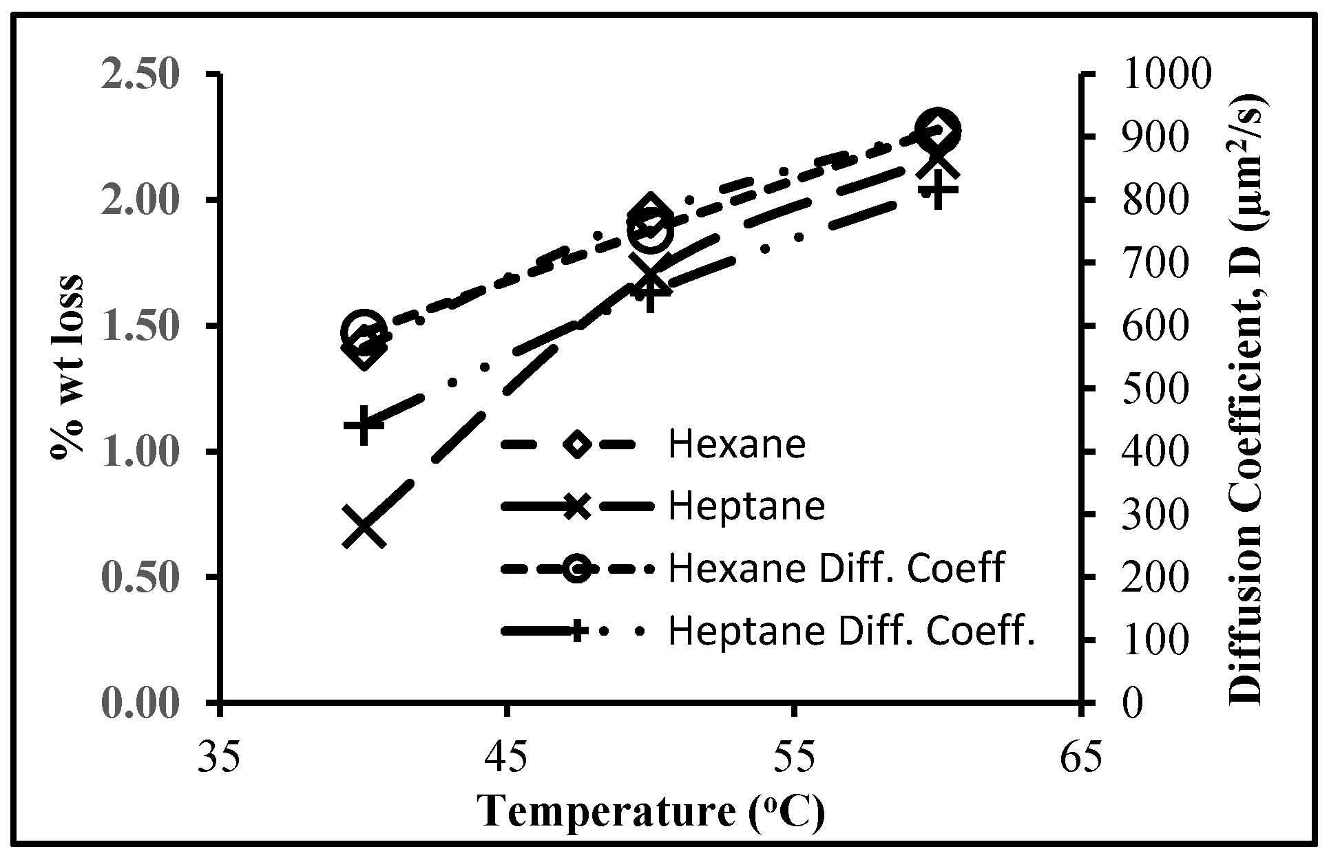 Percentage weight loss and diffusion coefficient at different temperatures during first hour of solvent extraction for F2 feedstock formulation.