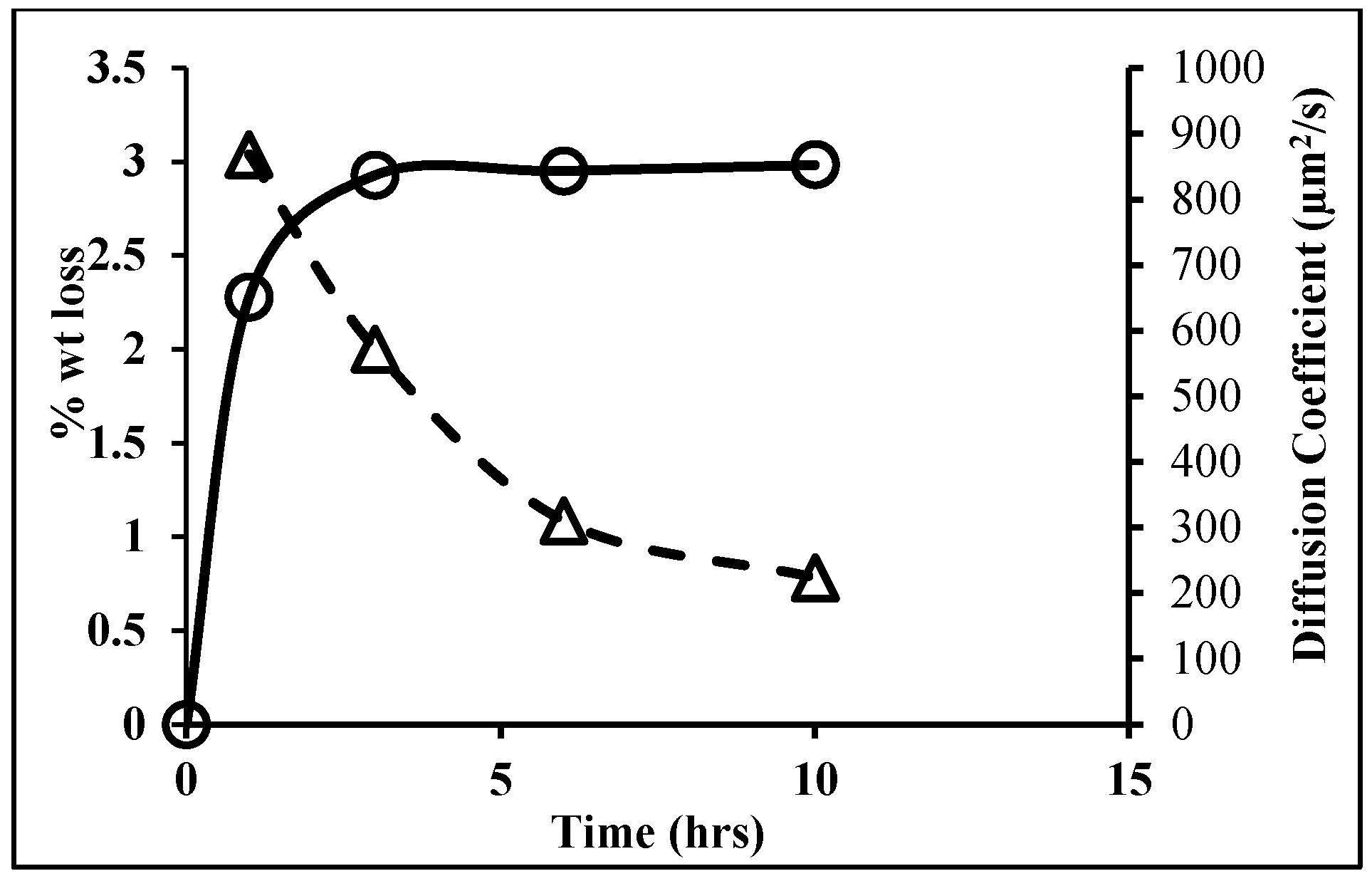 From Figure 13, using hexane as the choice of organic solvent, the total amount of RWFO extracted increases by increasing the extraction time from 1 to 3 h, whereas increasing the extraction time from 5 to 6 h does not give any significant change of weight loss percentage on the part. Also as the total percentage weight loss was increase, the diffusion coefficient decreased with time. This is true as stated by Fick’s 2nd Law that fluid migration in the matrix occurs mainly through diffusion and concentration drive this migration [39]. During the first hour, concentration of the RWFO was higher in the green compact and reducing after several hours during extraction process. The percentage weight loss is stabilized after 3 h, which reaches about 3 wt. % loss of RWFO. This means that the total amount of binder extracted is not affected by increasing the extraction time over 3 h. The diffusion coefficient of RWFO decreases clearly from 868 to 223.6 μm2/s by increasing the extraction time from 1 to 10 h.