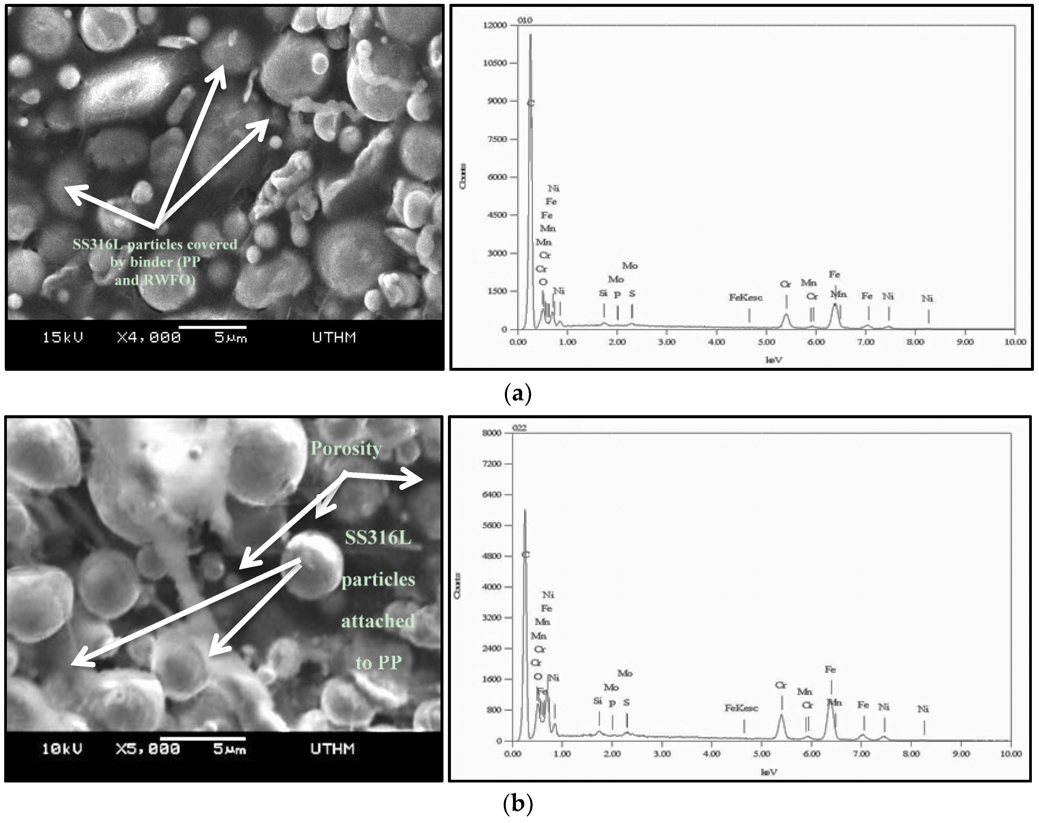 The green compact after solvent debound for 3 h were then undergoing DSC analysis to monitor the remaining RWFO in the green compact. From Figure 14a, initially two peaks are observed indicating two binder components exist in the green compact. After solvent extraction process, RWFO peaks vanish which leaves only PP melting and crystalline temperature peaks (Figure 14b). This analysis was done on the sample taken from the center of the green compact after solvent extraction had taken place. This indicates that the RWFO were successfully extracted out of the green compact. From Scanning Electron Microscope (SEM) image and Energy dispersive spectroscopy (EDS) analysis (Figure 15a), it can be seen that most of the powder particles are covered by PP and RWFO. Figure 15b shows the results of porosity existence inside the green compact leaving only PP to hold the powder particles after 3 h solvent extraction process. The existence of porosity inside the green compact would create a channel that helps the diffusion of degraded PP during thermal debinding process. Carbon content from the green compact also reduced due to the disappearance of RWFO from the green compact as can be seen on the first peaks of each EDS profile. Figure 11d shows the comparison of the dimensional changes of the green compact before and after the solvent extraction process. No significant dimension changes can be seen on the components. After undergoing thermal debinding process, significant changes in dimension are observed where about 1% shrinkage occurs (will not be discussed in this paper).