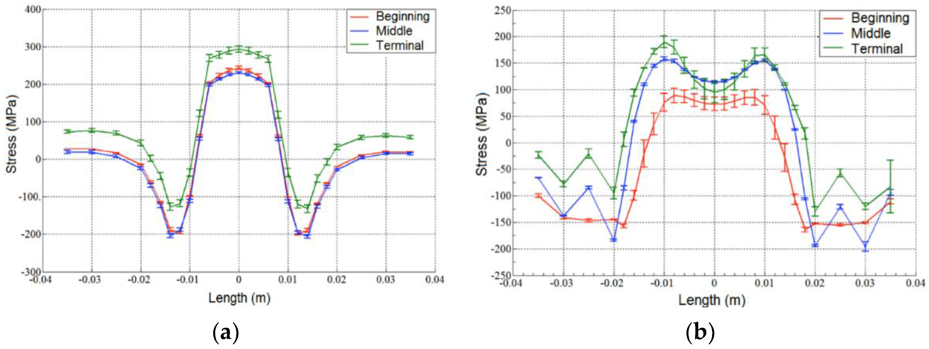 - Guimarães, P.B.; Pedrosa, P.M.A.; Yadava, Y.P.; Barbosa, J.M.A.; Filho, A.V.S.; Ferreira, R.A.S. Determination of residual stresses numerically obtained in ASTM AH36 steel welded by TIG process. Mater. Sci. Appl. 2013, 4, 268–274. [Google Scholar] [CrossRef] [Green Version]