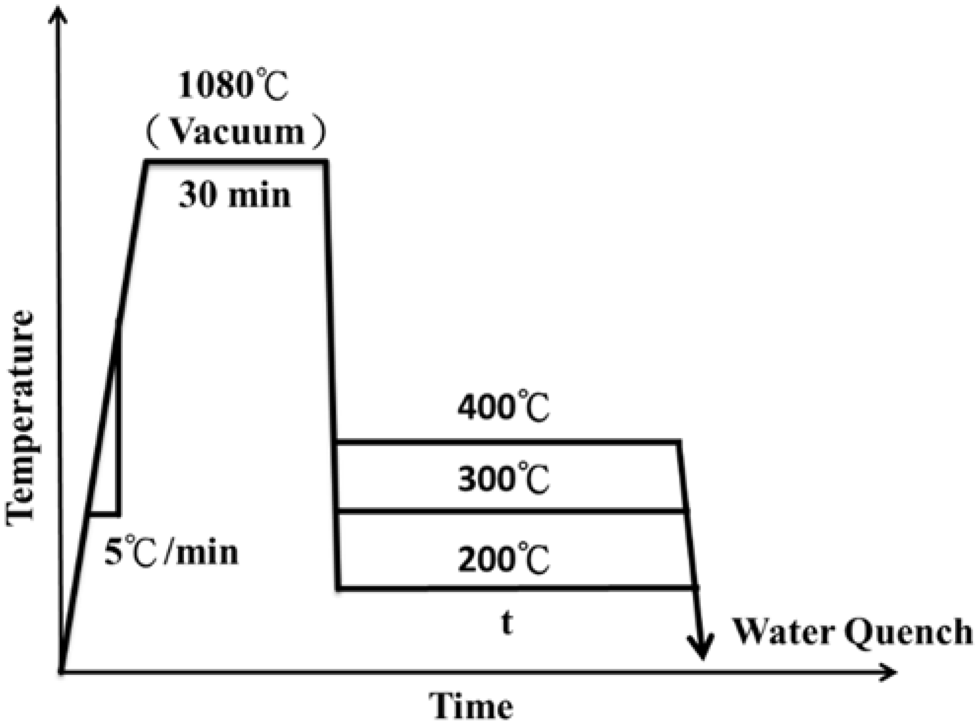 The chemical composition of SUS440 is given in Table 1, the carbon content is 0.75% by mass, the chrome content is 18% by mass, and it contains other alloying elements, such as Si, Mn, and V. This research uses a double loop-type thin plate (t = 0.78 mm) specimen to examine the effects of the punch-shear process on brittleness. Figure 1 shows the dimensions of the specimen. Figure 2 shows a diagram of the austempering process. The heat treatment condition of the specimen was 1080 °C (vacuum) held for 30 min for austenitic treatment (the austenite conditions of all specimens are the same), and then the specimen was immediately moved into a salt-bath furnace for austempering. There were two different conditions for the salt-bath phase and thus two sets of specimens were prepared. The first set underwent the same salt-bath time (120 min) and different constant temperatures (200, 300, and 400 °C), and were then quenched in the water. The second set underwent the same salt-bath temperature (300 °C) and different time intervals (30, 60, 90, and 120 min), and were then quenched in the water. Each austempering condition was called x °C-y min, based on the salt-bath condition, such as 200 °C-120 min [7,8].